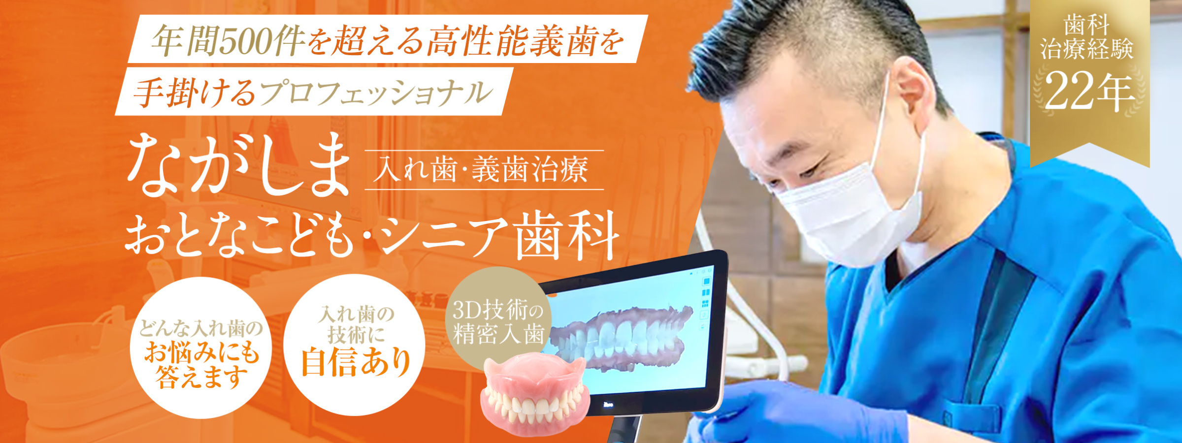実績が豊富な私自身が、責任を持って皆さま一人ひとりのお悩みに合わせ快適な入れ歯をお作りいたします。